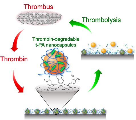 Thrombosis-Responsive Thrombolytic Coating Based on Thrombin-Degradable Tissue Plasminogen Activator (t-PA) Nanocapsules