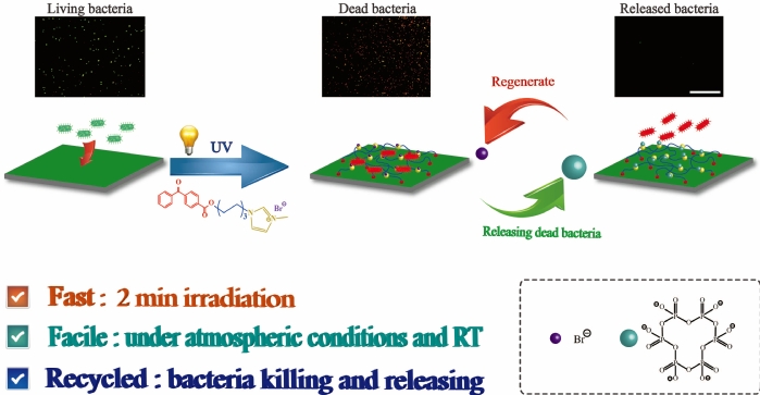 细菌在材料表面的黏附所引起的炎症和污染严重影响着人类健康,食品安全以及医疗器械等诸多方面。而现在抗菌表面不仅需要有着高效杀菌的性能,同时应具有释放堆积在表面死细菌的能力,避免再次引起感染并实现样品表面可重复利用。在这篇文章中,首次合成了一种新型的二苯甲酮类离子液体衍生物BMI,将光引发基团与杀菌基团结合在一个化合物中。通过紫外光照2 min在硅片表面原位构建了一层聚合物抗菌涂层。涂板法抗菌实验结果表明该表面对于革兰氏阴性菌以及革兰氏阳性菌都有着较高的杀菌率。最后,可通过表面反离子交换,将样品表面的Br-成功交换为PP6-反离子来释放堆积在表面的死细菌,结果显示反离子交换后的表面有着优异的释放细菌性能且在3次循环内都能维持较高杀菌率和释放细菌率。该方法可作为一种快速、简单且制备抗菌表面的方法应用于生物医学领域。