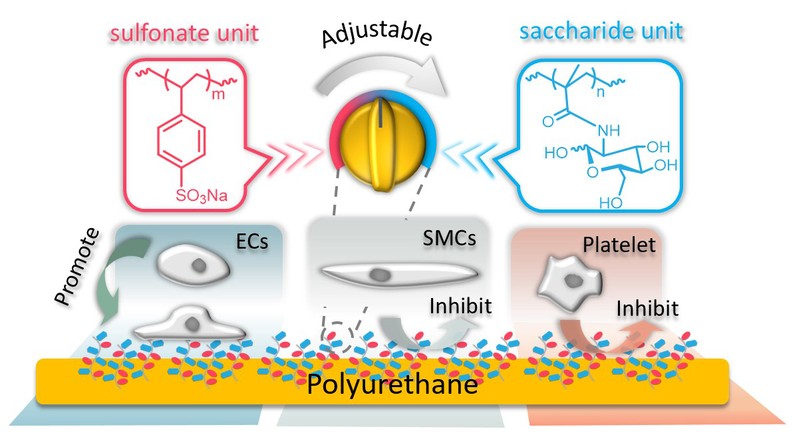 我们基于将肝素拆分成“糖单元”和“磺酸单元”这一概念,合成了一系列经类肝素改性的抗凝血表面。甲基丙烯酰胺葡萄糖胺(MAG)和对苯乙烯磺酸钠(SS)作为聚合单体,在PU表面通过自由基聚合反应进行接枝反应。该接枝方法简单,而且材料表面糖单元(MAG)和磺酸单元(SS)比例可通过改变投料比来进行调节。均聚物接枝的材料,即表面仅包含糖单元或磺酸单元,在细胞-材料反应,如血小板粘附、血管内皮细胞的黏附和增殖以及平滑肌细胞的粘附和增殖等方面,具有较大差异。共聚物改性的材料表面,当磺酸与糖比例为2:1(即PU-PS1M1)时,抗凝血效果最佳。在细胞粘附实验中,该材料(PU-PS1M1)显示血小板和人脐静脉平滑肌细胞密度最低,脐静脉内皮细胞密度最高,而且最长的血浆复钙化时间。这种材料具有多功能的特性,表明了血液接触中的抗血栓性能。