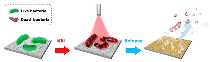 随着耐药性细菌的出现,传统抗菌表面正在逐步失去作用,此外,死细菌在表面积累导致细菌进一步的繁殖仍然是困扰研究学者的一个棘手问题。为了解决这些问题,本工作中,我们在材料表面逐步沉积金纳米粒子沉积膜(GNPL)以及相转变溶菌酶膜(PTLF)从而制备了一种可再生抗菌表面(GNPL-PTLF),这种表面同时具有光热杀菌性能以及死细菌释放性能。由于GNPL的光热效应,在近红外光NIR的照射下,GNPL-PTLF在5 min之内能对黏附在其表面的细菌(尤其是耐药性细菌)达到﹥99%的杀菌率。此外,最上层的PTLF层在维生素C(Vc)溶液短时间浸泡的作用下能够被迅速降解从而导致死细菌的移除以及表面再生。同时,PTLF的降解程度受Vc溶液的浓度以及PTLF在Vc溶液中浸泡时间的影响。因此,可以通过选择合适的Vc浓度以及合适的浸泡时间来使PTLF部分降解,从而此表面可以经过多个杀菌-释放循环利用。表面制备过程简单友好,并且可以应用于多种基材。