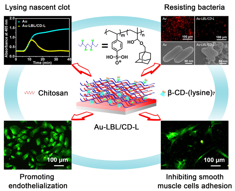 血液接触材料的植入所引起的血栓问题是导致其功能丧失的主要原因之一。但截至目前,我们仍然无法获得一个真正意义上的血液相容性材料表面。为了最大程度上抑制血液接触材料表面血栓的形成,赋予材料表面单一功能已远远不能满足实际需求。此外,生物材料植入体内后引起的细菌感染问题也是导致植入失败的主要原因。通过合理设计,构建具有多种生物功能的材料表面有望成为解决这些问题的一个有效途径。在本工作中,我们首先合成了对苯乙烯磺酸钠(SSNa)与甲基丙烯酸金刚烷甲醇酯(AdaMA)的共聚物P(SS-co-Ada),该共聚物与带有正电荷的天然聚合物壳聚糖通过层层自组装法(LBL)沉积在金(Au)基材表面,得到Au-LBL表面,最后通过金刚烷与β-环糊精(CD)之间的主客体相互作用将具有纤溶活性的CD-L固定至Au-LBL表面,得到Au-LBL/CD-L表面。其中,壳聚糖,P(SS-co-Ada)和CD-L 三种组分分别赋予表面抗菌性、血管细胞选择性和纤溶活性。我们通过简单的LBL方法及主客体相互作用制备出一种多功能血液接触材料表面,该表面具有促进材料表面内皮化、抑制平滑肌细胞黏附及增殖、降低细菌感染发生率以及溶解初生血栓等功能。这种多功能化改性策略的普适性强,可以方便地应用于其他生物医用材料表面。