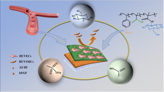 类肝素聚合物已经成为肝素的替代物,用于构建有效和安全的抗凝血表面。然而,目前的类肝素聚合物通常局限于葡萄糖和磺酸单元的组合,其抗凝血性能与结构的关系也不明确。受天然肝素结构的启发,我们合成了一系列由葡萄糖、磺酸和羧酸三个单元组成的新型类肝素聚合物(GSAs)。接着我们构建了由GSAs和两种典型的阳离子聚合物—聚乙烯亚胺和壳聚糖组成的人工细胞外基质,以探究GSAs的抗凝血性能和促内皮化的作用。通过改变三个单元的比例,我们系统地研究了各单元在基质中的功能。实验发现,磺酸含量的增加可以增强表面的抗凝血活性,葡萄糖和磺酸含量的增加能促进人脐静脉血管内皮细胞(HUVECs)的增殖,而羧酸含量的增加则抑制了人脐静脉血管平滑肌细胞(HUVSMCs)的粘附。这项工作揭示了GSAs结构对其抗凝血性能的重要影响,这为类肝素聚合物的设计、制备及其实际工程应用提供了参考。