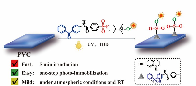 聚氯乙烯(PVC)是一种重要的生物医用材料,但缺乏方便的功能化方法。本文提出了一种将硫(VI)-氟交换(SuFEx)反应与苯并酮光化学反应相结合,实现PVC表面功能化的快速、有效、简便。亮点如下:(1)首次将“硫(VI)-氟交换”(SuFEx)反应与苯并苯酮光化学反应相结合,实现聚氯乙烯(PVC)表面功能化。(2)制备功能化聚氯乙烯表面只需一步光固定。(3)基于固定化分子的化学和生物功能,快速和高效的功能化可以在建立多用途PVC表面上有广泛的应用。