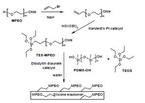 Monofunctional poly(ethylene oxide) polymers of molecular weight (MW) 350, 750, and 2000, respectively, were modified with Si(OEt)(3) groups. These polymers underwent classic condensation cure with hydroxy-terminated silicone polymers and Si(OEt)(4) to give composites with poly(ethylene oxide) (PEO) rich surfaces under aqueous conditions, as shown by contact angle and XPS data. The hydrophobicity of the surfaces was considerably higher in air. The greatest PEO concentration was observed with relatively short chain polymers of MW 350. Silicone polymers bearing short chain PEO chains were also observed to be the most protein rejecting from either buffer (fibrinogen) (90%) or plasma (85%). The silicone/TES-MPEO formulation offers the advantage of a one step/one shot polymerization process that gives materials with a high protein rejection ability than can be cast as films, or molded into complex shapes. Covalently linked PEO films of a variety of chain lengths and total surface coverage can be readily accommodated.