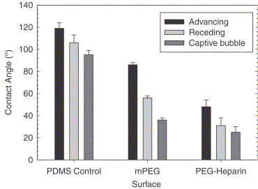 A novel method of immobilizing heparin on a silicone surface through a heterobifunctional PEG spacer was used yield well defined surfaces with highly active surface immobilized heparin and low non-specific protein adsorption. The heparin surface density achieved using this technique was 0.68 mu g/cm(2). Sessile drop water contact angles showed increased hydrophilicity of the silicone surface after PEG modification and a further decrease in the contact angles following the grafting of heparin. High specificity for ATIII with little fibrinogen adsorption was noted in plasma adsorption studies. This ATIII adsorption was mediated by the heparin layer, since surfaces modified with PEG only did not adsorb significant quantities of AT. The thrombin resistance of the heparin modified surfaces was demonstrably greater as measured by a chromogenic thrombin generation assay. The results suggest that the heterbifunctional PEG linker results in a high density of active heparin on the surfaces.