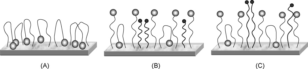 Polyurethanes were modified using monobenzyloxy polyethylene glycol (BPEG) which possesses a bulky hydrophobic benzyloxy group at one end and a hydroxyl group at the other end as a preconstructed BPEG layer, and poly(ethylene glycol) (PEG) and monomethoxyl poly(ethylene glycol) (MPEG) with various chain lengths as fillers. Our objective was to investigate the effect of PEG graft density and conformation on protein adsorption at PEGlated surface. The graft density was estimated by a chemical titration method. The combination of ATR-FTIR, AFM and titration results provide evidences that the graft density can be increased by backfilling PEG or MPEG to a BPEG layer. However, fibrinogen and albumin adsorption significantly increased on all surfaces after PEG or MPEG backfilling. We conclude that the conformation of hydrophobic benzyloxy end groups of the BPEG layer plays a key role. The benzyloxy end groups of preconstructed PEG chains stretch to the surface after PEG backfilling, which possibly accounts for the observed increase in protein adsorption. The BPEG conformation change after backfilling with PEG or MPEG was also suggested by contact angles. Additionally, protein adsorption was slightly influenced by the length of filler, suggesting a change in surface morphology.