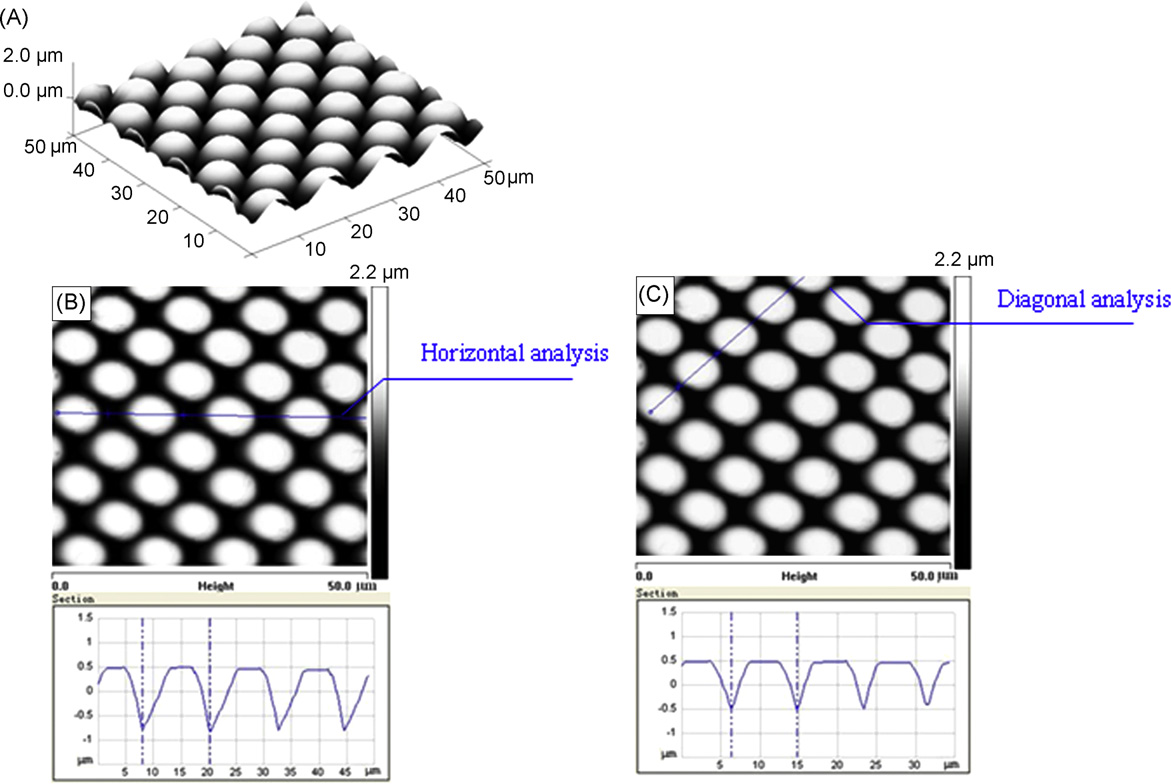 used to study its adsorption on flat and patterned surfaces. Patterned surface has a 46% increase in the adsorption of Fg when compared with flat surface. However, the surface area of the patterned surfacewas only 8%larger than that of the flat surface. Therefore, the increase in the surface areawas not the only factor responsible for the increase in protein adsorption. Clear fluorescent pattern was visualized on patterned surface, indicating that adsorbed Fg regularly distributed and adsorbed most on the flanks and valleys of the protrusions. Such distribution and local enrichment of Fg presumably caused the specific location of platelets adhered from platelet-rich plasma (PRP) and flowing whole blood (FWB) on patterned surface. Furthermore, the different combination of surface topography and pre-adsorbed Fn could influence the adhesion of L929 cells. The flat surface with pre-adsorbed Fnwas the optimum substrate while the virgin patterned surface was the poor substrate in terms of L929 cells spread.