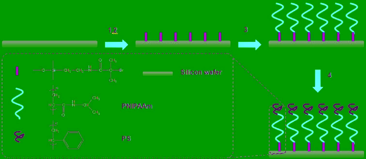 Diblock copolymer grafts covalently attached to surfaces have attracted considerable attention because of their special structure and novel properties. In this work, poly(N-isopropylacrylamide)-block-polystyrene (PNIPAAm-b-PS) brushes were prepared via surface-initiated consecutive atom-transfer radical polymerization on initiator-immobilized silicon. Because of the inherent thermosensitivity of PNIPAAm and the hydrophobicity difference between the two blocks, the modified surfaces were responsive to both temperature and solvent. Moreover, the diblock copolymer brushes exhibited both resistance to nonspecific protein adsorption and unique cell interaction properties. They showed strong protein resistance in both phosphate-buffered saline and blood plasma. In particular, fibrinogen adsorption from plasma at either room temperature or body temperature was less than 8 ng/cm2, suggesting that the surfaces might possess good blood compatibility. In addition, the adhesion and detachment of L929 cells could be “tuned”, and the ability to control the detachment of cells thermally was restored by block polymerization of hydrophobic, cell-adhesive PS onto a thicker PNIPAAm layer. In addition to providing a simple and effective design for advanced cell-culture surfaces, these results suggest new biomedical applications for PNIPAAm.