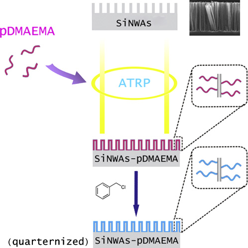 Materials of high antibacterial activity based on quaternized poly (2-(dimethylamino ethyl) methacrylate)(pDMAEMA) have been developed. DMAEMA was graft polymerized on silicon nanowire arrays (SiNWAs) by atom transfer radical polymerization (ATRP), and quaternized using benzyl chloride. The graft density on the modified nanowire arrays was much higher than on analogous smooth silicon, leading to higher bacterial adhesion on the nanowire arrays (34.6±0.39×106 vs. 5.0±0.15×106 cells/cm2). Incubation of Escherichia coli on the substrates for 18 h resulted in 95% cell death on the quaternized nanowire material compared to less than 45% on the quaternized smooth silicon. The results suggest that silicon nanowire array modified with quaternized pDMAEMA is a highly effective antibacterial material due to a high density of antibacterial polymer and consequent high bacterial adhesion and killing.