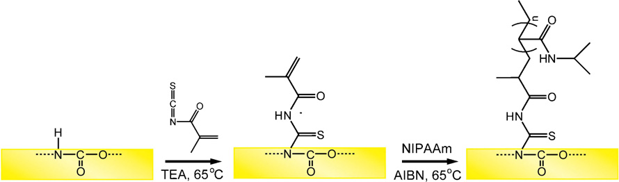 In this work, the effect of molecular weight (MW) of surface grafted poly(N-isopropylacrylamide) (PNIPAAm) on protein adsorption and cell adhesion was investigated systematically. PNIPAAm-grafted polyurethane (PU) surfaces of varying graftMWwere prepared via conventional radical polymerization.The MW was controlled by adjusting the monomer concentration. Fibrinogen (Fg) and human serum albumin (HSA) were selected as model proteins and their adsorption from phosphate-buffered saline (PBS, pH 7.4) and blood plasma at 37 ◦C was measured using a radiolabeling method and immunoblot analysis respectively. It was found that in both media, as theMWincreased, the adsorption of these two proteins decreased gradually reaching a plateau value at MW above 7.9×104. Compared to the unmodified PU, the surface grafted with PNIPAAm of MW 14.6×104 reduced the adsorption of Fg and HSA in PBS by 91% and 86%, respectively. Moreover, the surfaces with higher MW PNIPAAm showed minimal adhesion of L929 cells presumably due to the absence of cell-adhesive proteins on the surfaces.