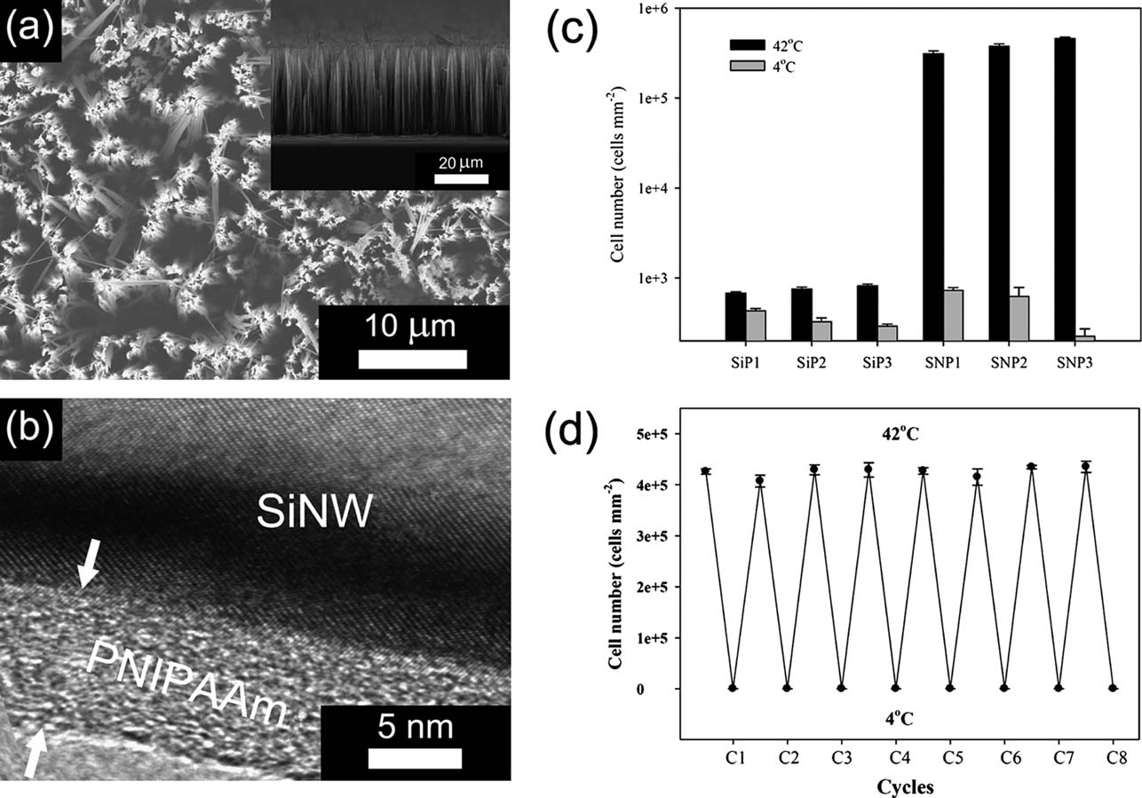 We introduce poly(N-isopropylacrylamide) decorated silicon nanowire arrays as a novel nano-catalyst for DNA transformation.Almost all of the steps in the transformation process are facilitated by the nano-catalyst, such as DNA acquisition, cell adhesion, DNA transfer, and transformant release. It can promote DNA transformation dramatically and meets the requirements for recombinant DNA operations, including molecular library construction.