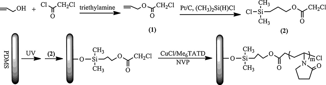 A new method for the modification of poly(dimethylsiloxane) (PDMS) elastomer surfaces with hydrophilic poly(N-vinylpyrrolidone) (PVP) has been developed. PVP chains were grafted from the PDMS surface by surface-initiated atom transfer radical polymerization (SI-ATRP). The resulting surfaces were characterized by X-ray photoelectron spectroscopy (XPS), attenuated total reflectance Fourier transform infrared spectroscopy (ATR-FTIR), atomic force microscopy (AFM) and water contact angle measurements. It was shown that the modified surfaces were strongly hydrophilic, indicating that the PVP grafts dominate the surface and define its properties. The anti-fouling properties of the grafted surfaces were demonstrated in protein adsorption and cell adhesion experiments. Both protein adsorption and cell adhesion were inhibited significantly on the PVP-modified PDMS surfaces compared to unmodified controls. It is concluded that modification by SI-ATRP grafting of PVP is an effective method for the preparation of anti-biofouling PDMS materials.