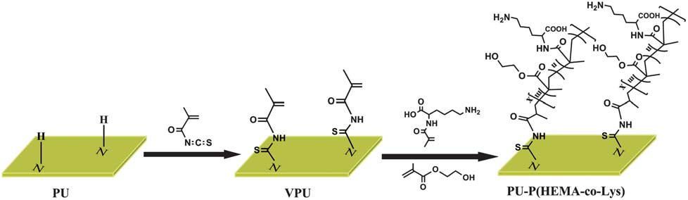 A new strategy to regulate the attachment of plasminogen and its activator, t-PA, to a polyurethane surface is reported. The method is based on the one-step graft copolymerization of a lysine-containing methacrylic monomer and hydroxyethyl methacrylate (HEMA). The copolymer-modified PU surfaces showed high capacity for plasminogen and t-PA binding. The release of pre-adsorbed t-PA from the lysine-containing PU surfaces in contact with plasma was also investigated. It was shown that the interactions of plasminogen and t-PA on this type of surface can be controlled simply by changing the monomer feed ratio, and thus the relative quantities of HEMA and lysine in the grafts. This approach may be useful for the development of fibrinolytic, blood-contacting materials and, more generally, for controlling protein-surface interactions for biocompatibility.