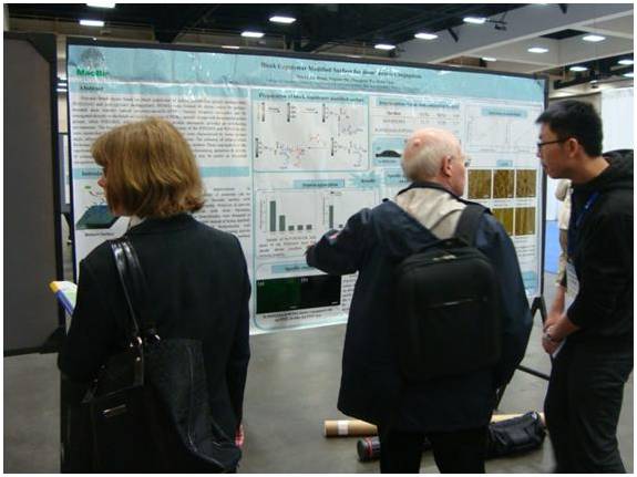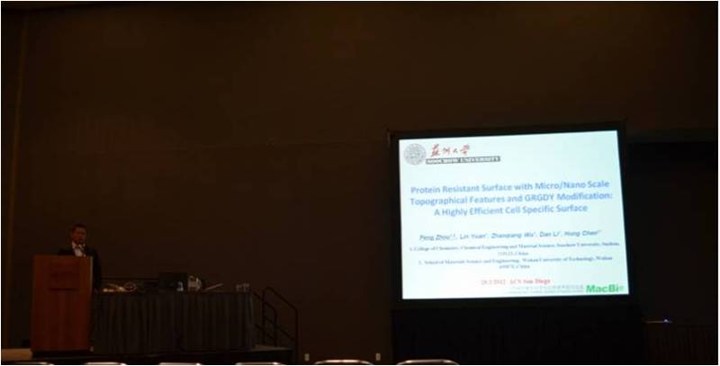 分会场“Colloids and surface chemistry”集合了国际蛋白质与生物表界面研究领域的著名学者和专家,与会者展开了对该领域近期研究的热点广泛深入的探讨。博士生周峰在该会场做了题为“Protein resistant surface with micro/nano scale topographical features and GRGDY modification: A highly efficient cell specific surface”的口头报告。硕士生李鑫墙报部分“Block Copolymer Modified Surface for Biomolecules Conjugation”展示了最新的研究成果。