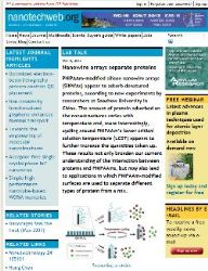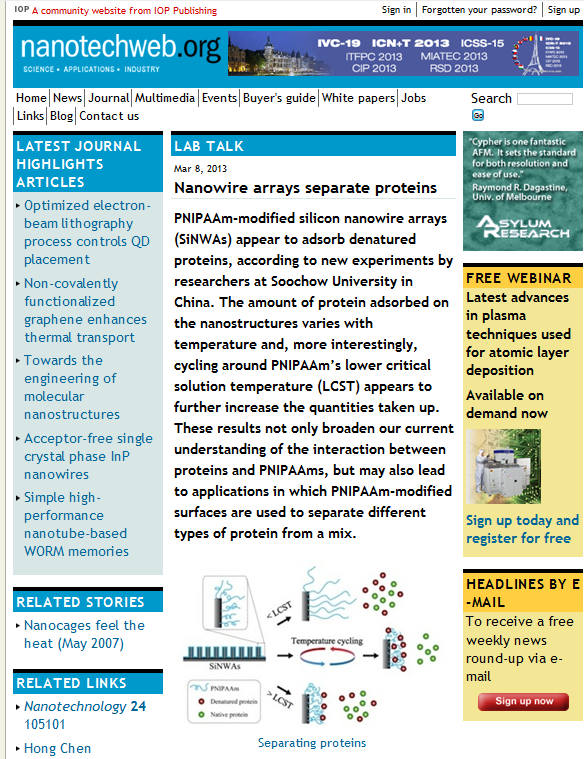 2013年3月8日,nanotechweb.org网站以整版篇幅报道了我实验室在利用温敏性聚合物聚(N-异丙基丙烯酰胺)修饰的硅纳米线阵列选择性分离变性蛋白质的最新研究成果。http://nanotechweb.org/cws/article/lab/52654