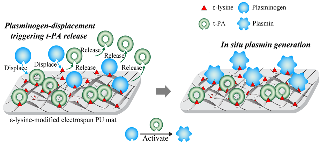 本文依据蛋白替换原理研究了一种新颖的组织纤溶酶原激活物t-PA的释放体系。利用ε-赖氨酸对纤维蛋白溶酶原和t-PA特异性亲和力的差异,负载有t-PA的赖氨酸化PU电纺纤维膜在接触血浆时借助纤维蛋白溶酶原的替换作用来实现t-PA的释放并同时激活表面所结合的纤维蛋白溶酶,从而实现原位产生纤维蛋白溶酶。因此,这种方法有望在表面ε-赖氨酸化这一单一化学设计中实现t-PA释放系统与表面纤溶系统的结合。