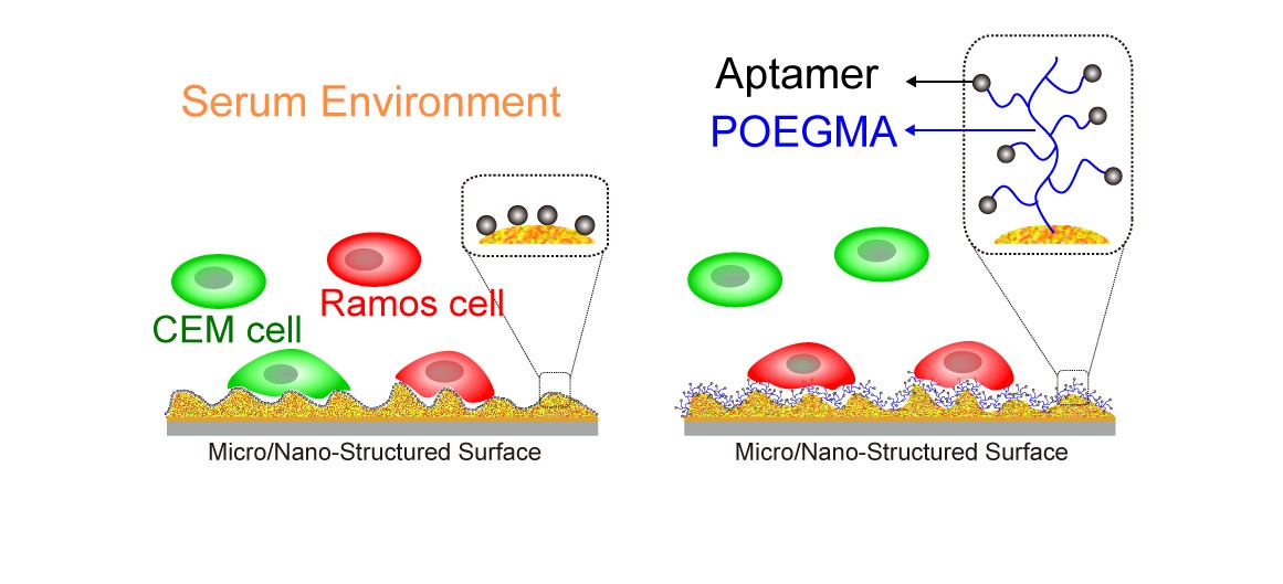本文在金表面构建由金纳米粒子聚集体(GNPL)构成的微纳米级拓扑结构,并在其表面修饰上能与特定的癌细胞特异性结合的核酸适体(APT)TD05(GNPL-APT)。结果显示,GNPL-APT在血清环境中对Ramos细胞的选择性远远不及在无血清环境中对其的选择性。为了提高在有血清条件下表面对Ramos细胞的选择性,我们在GNPL表面引入抗非特异性粘附的聚甲基丙烯酸寡聚乙二醇酯(POEGMA)间隔臂,然后链接APT,该表面在血清环境中对Ramos细胞的选择性显著增强,并且该选择性随着粗糙度的提高而逐步增强。本研究结果表明将表面化学性质与微纳米粗糙结构相结合这一策略有望在细胞分离(包括癌细胞的分离检测)等领域发挥作用。