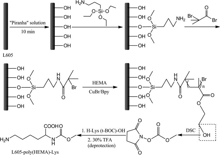 Prevention of coagulation appears not to be possible when a foreign surface is in contact with blood; the alternative concept of a clot lysing surface has therefore been suggested. In this work, a mimic of the fibrinolytic system was constructed on L605 cobalt–chromium coronary stents. Lysine which, immobilized on a surface, has been shown previously to adsorb plasminogen in contact with blood was attached to the stent using poly(2-hydroxyethyl methacrylate) (poly(HEMA)) as a spacer. The lysine-poly(HEMA) modified stent was shown to have low nonspecific protein adsorption and to bind plasminogen in high quantity from plasma. Following exposure to plasma and treatment with tissue plasminogen activator, the lysine-modified stents showed clot-lysing properties in vitro while the unmodified L605 stents did not. It was shown that the modified stents retained their clot lysing properties after 24 h exposure to plasma.