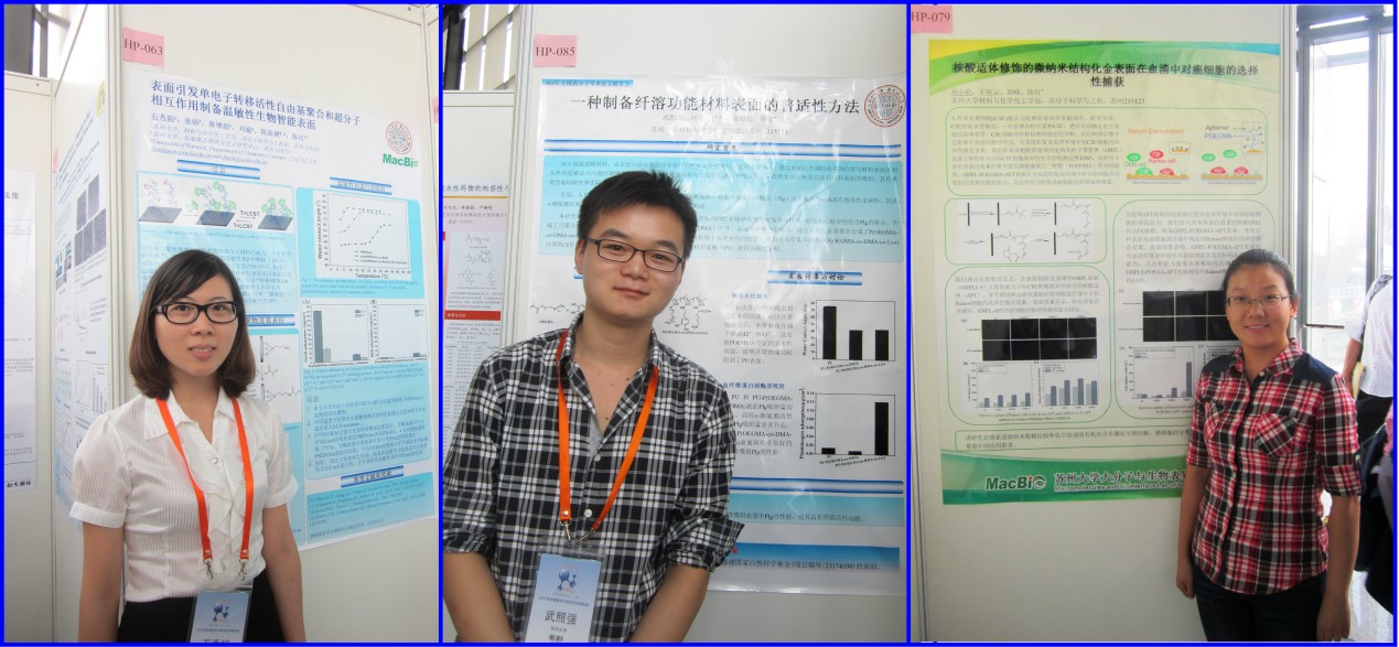 在本次会议中,我实验室陈红教授受邀主持了16日上午“医用高分子”分会场的报告,并作了题为“生物材料表界面”的邀请报告。实验室袁琳教授于15日上午作了题目为“温敏性硅纳米线阵列在生物医学研究中的应用”的口头报告。石秀娟博士研究生获得“2013年全国高分子学术论文报告会”优秀墙报奖。