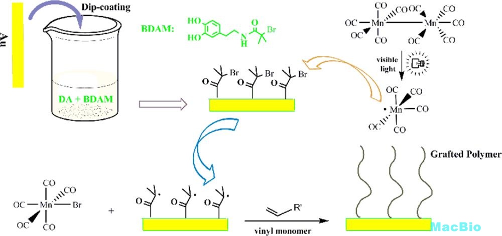 我们报道了一种全新的基于Mn2(CO)10的可见光引发的金表面聚合,该聚合结合了可见光聚合的优点和邻苯二酚类烷基溴的稳定性。文中以温敏性聚合物PNIPAAm为模型,与传统聚合相比,该聚合在室温条件下仅10min聚合物刷就达到200nm。并且,在金片、玻璃片、PDMS和QCM-D片上成功制备的不同种类的聚合物,不仅说明了该方法具有很好的普适性,而且说明了该方法在设计功能性方面的巨大潜力。