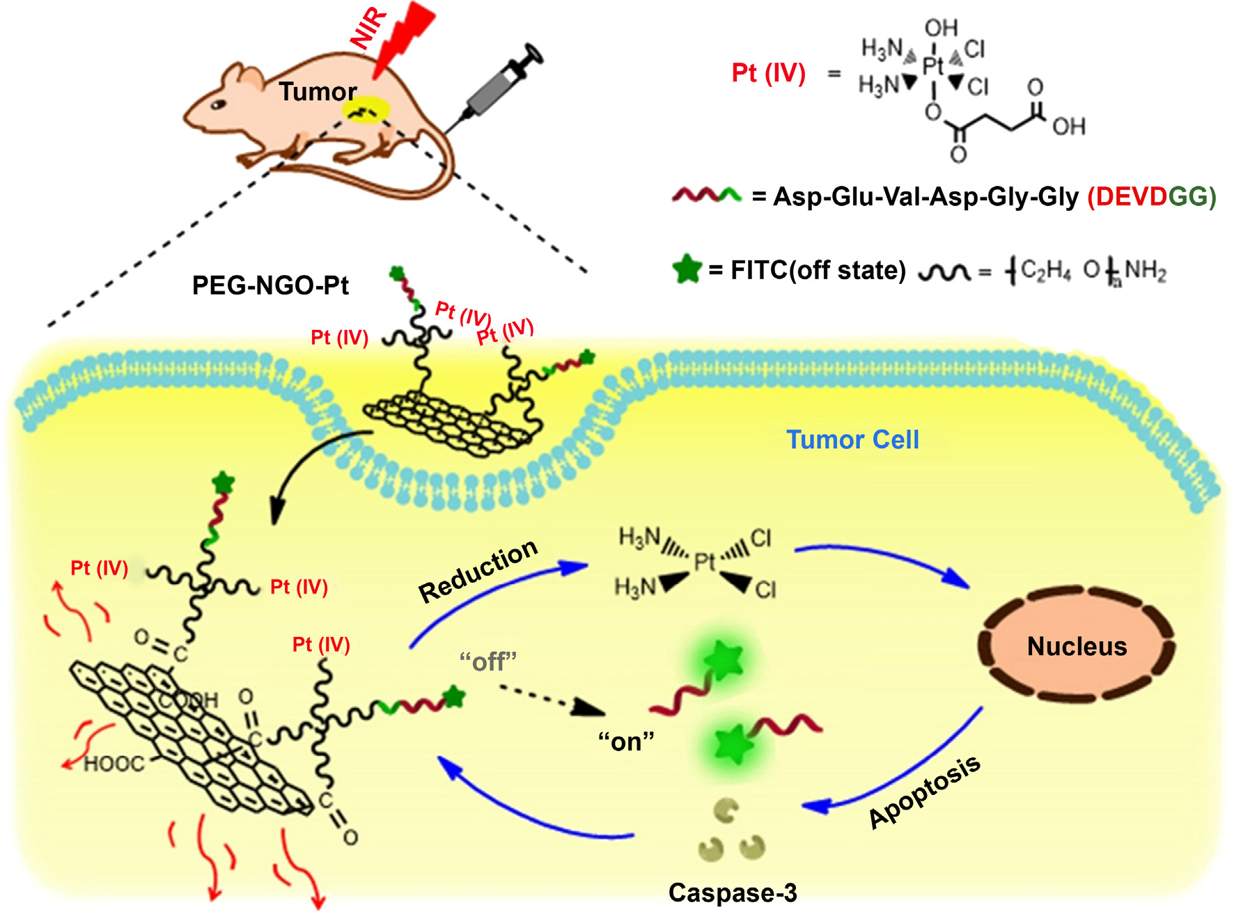 顺铂(Pt (II))是肿瘤治疗中非常重要的一种药物,它已经被用于多种癌症的临床治疗中。然而Pt (II)的应用却受到了它自身毒副作用,与其他生物分子的非特异性结合,以及难以在肿瘤组织中富集等因素的限制。近年来,通过联合光热治疗和化疗的方法,来提高癌细胞对药物的摄取或者实现药物的靶向释放,已经成为增强抗癌药物治疗效果的有效手段。与其它具有光热效应的材料(比如金纳米棒,碳纳米管等)相比,纳米氧化石墨烯(NGO)具有高比表面积,较强的近红外光吸收能力和光热转换效率,以及水溶性和生物相容性较好等优点。对于同时将药物和热能运输到肿瘤组织的光热治疗与化疗联合的抗肿瘤治疗,NGO已经表现出了极大的应用潜力。到目前为止,虽然NGO已被成功用于许多抗癌药物的治疗研究中,但还没有报道将NGO与Pt (II)药物结合用于光热治疗和化疗联合的抗肿瘤治疗。在本研究中,我们以NGO为载体,在修饰细胞凋亡响应性荧光探针和顺铂的衍生物Pt (IV)后制得了功能化纳米复合物PEG-NGO-Pt,建立了同时具有光热治疗和化疗联合的抗肿瘤治疗功能和实时监测功能的治疗诊断体系。研究结果表明,PEG-NGO-Pt实现了药物靶向运输和释放,同时光热治疗和化疗的协同效应使得PEG-NGO-Pt可以完全抑制肿瘤的生长,并避免了对机体的毒副作用。