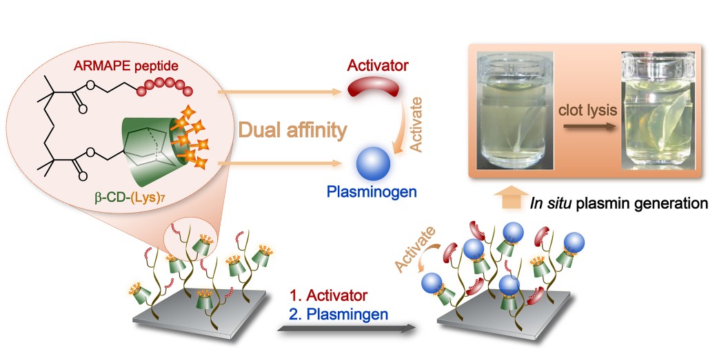 本文通过引入血纤维蛋白溶酶原(Plg)及组织型纤溶酶原激活剂(t-PA)相应的亲和性配体实现表面原位产生纤溶酶,进而溶解表面形成的初生血栓。首先通过表面自由基聚合在聚氨酯表面接枝了聚(甲基丙烯酸羟乙酯-甲基丙烯酸金刚烷甲醇酯)共聚物刷,其次利用共价修饰法和主客体相互作用在表面先后引入ARMAPE多肽和赖氨酸修饰的β-环糊精分子,分别作为t-PA和Plg的亲和性配体。改性后的聚氨酯表面同时具有高的t-PA和Plg结合能力,并且负载了t-PA的表面能够从血浆中选择性结合Plg并原位生成高催化活性的纤溶酶,从而赋予材料表面纤溶活性。本研究制备双重亲和性表面的方法可以用到其他生物活性表面,进而有效实现材料在体内环境的生物学功能。