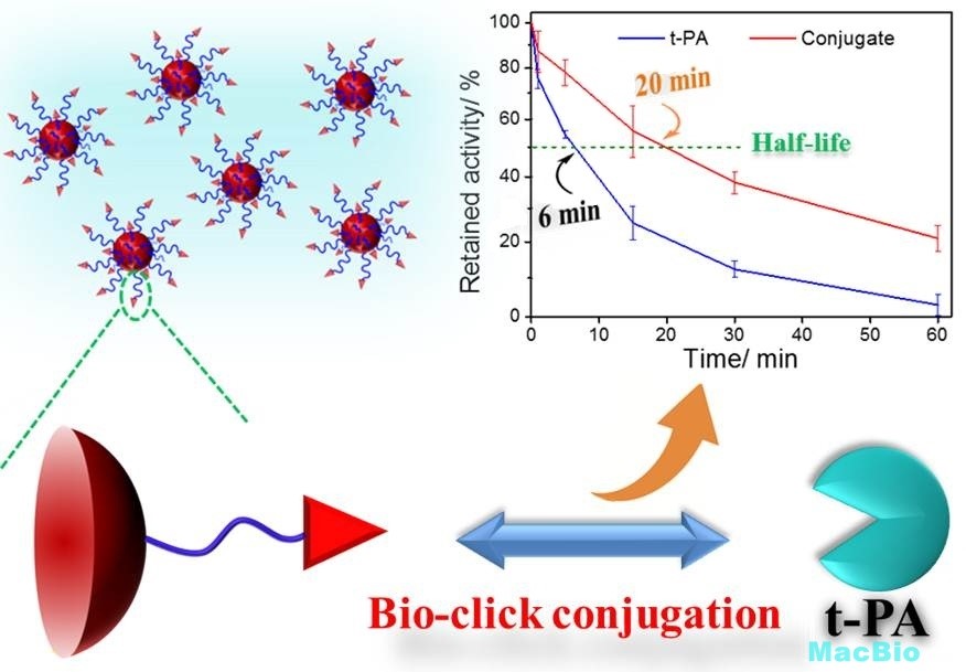 2015年 9月23日Journal of Materials Chemistry B公布2015年热点文章名单,我组唐增超同学题为“A t-PA/nanoparticle conjugate with fully retained enzymatic activity and prolonged circulation time”的文章入选。该文章主要利用配体-受体间的特异性相互作用将t-PA负载到了含赖氨酸聚合物修饰的金纳米粒子上面,从而制备了一种conjugate。t-PA结合到纳米粒子上不仅保持了原有的纤溶活性,而且在一定程度上阻止了与其抑制剂(PAI-1)之间的相互作用。另外,与纯蛋白t-PA相比,conjugate可以延长其在小鼠体内的循环半衰期。