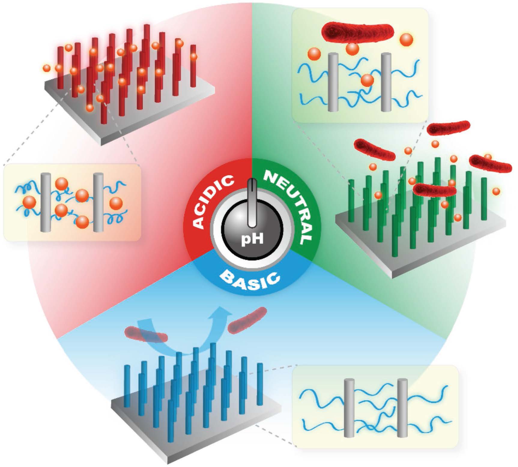 对于诸多人类医疗和工业应用而言,不仅赋予表面有效杀死细菌的能力,且赋予其快速、可重复释放死亡细菌的能力,是一项很有前途、具有挑战性的工作。在本文中,利用刺激响应性聚合物和具有独特形貌的纳米材料的协同效应,构建了一种按需切换功能的智能抗菌表面。pH响应性聚合物,聚甲基丙烯酸修饰的硅纳米线阵列,既可以作为一个动态的储存库,用于可控负载、释放天然抗菌剂溶菌酶,同时还可以用作自清洁的平台,用以释放死亡的细菌及重新负载新的溶菌酶用于重复性应用。该表面的功能可以通过逐步改变环境pH简单切换,且该功能性经几个kill-release周期循环后仍可以有效地保持。本文的结果提供了一种设计具有可切换功能的表面的新方法,在生物医学和生物技术领域具有潜在的应用价值。