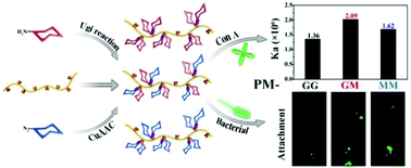 For synthetic glycopolymers, multivalent carbohydrate–protein interactions have been mostly studied in homoglycopolymers so far. However, natural oligosaccharides tend to consist of various sugars and this kind of heterogeneity is used to tune affinity and selectivity towards a specific receptor. Here we report a novel method to synthesize modularized heteroglycopolymers with well-defined sugar units in the side chain via Ugi reaction and click chemistry. To verify the modularized structures, mPEG-COOH was used as the model polymer substrate to test the Ugi reaction and subsequent click chemistry, and NMR, GPC and MALDI-TOF mass spectrometry confirmed our design. The obtained heteroglycopolymers (PM-GM) and homoglycopolymers (PM-GG and PM-MM) prepared via the methods assembled in aqueous medium with a diameter of 80 nm by DLS and 50 nm by TEM, and were used to investigate their interactions with lectins. Turbidity assay, QCM-D experiments and bacterial adhesion studies all demonstrate that heteroglycopolymers have higher affinity towards specific proteins than do homoglycopolymers, as a result of the heteromultivalent effect and binding ability between different sugar moieties and lectins
