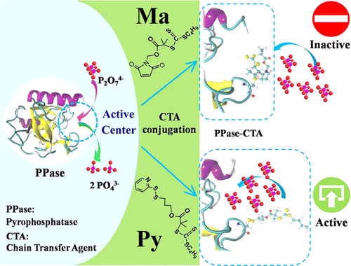 Protein has been widely applied in biotechnology and biomedicine thanks to its unique properties of high catalytic activity, outstanding receptor–ligand specificity, and controllable sequence mutability. Owing to the easily induced structural variation and thus the inactivation of protein, there has been much effort to improve the structural stability and biological activity of proteins by the use of polymers to modify protein to construct protein–polymer conjugates. However, during the conjugation of polymer to protein active center, the great loss in the original biological activity of the protein is still a serious and so far unsolved question. Here, for the purpose of preparing site-directed and highly structurally stable protein–polymer conjugate, which would possess at least a substantially similar level of biological activity as the original unmodified protein, we proposed a new strategy by using a pyridine chain-transfer agent (CTA-Py) with a soft pyridine-terminated chain for visible-light-induced reversible addition–fragmentation chain transfer (RAFT) polymerization specifically on a number of sites close to the protein active center. The results showed that all the intermediate conjugates PPa–CTA-Py at different modification sites could retain full enzymatic activities (about 110–130% of the unmodified PPa). It was demonstrated by dynamic computer simulation that introducing of CTA-Py had little interference to the protein spatial structure as compared to the popular maleimide chain-transfer agent (CTA-Ma) with rigid maleimide-terminated. Moreover, intermediate conjugates PPa–CTA-Py is facile and ready for further light polymerization under mild conditions. Final PPa–PNIPAAm conjugate produced from CTA-Py exhibited excellent temperature responsiveness and maintained its enzymatic activity even at high temperature. These highly stable and responsive protein–polymer conjugates have great potential and could be widely used in various industrial, chemical, biological, and pharmaceutical applications.
