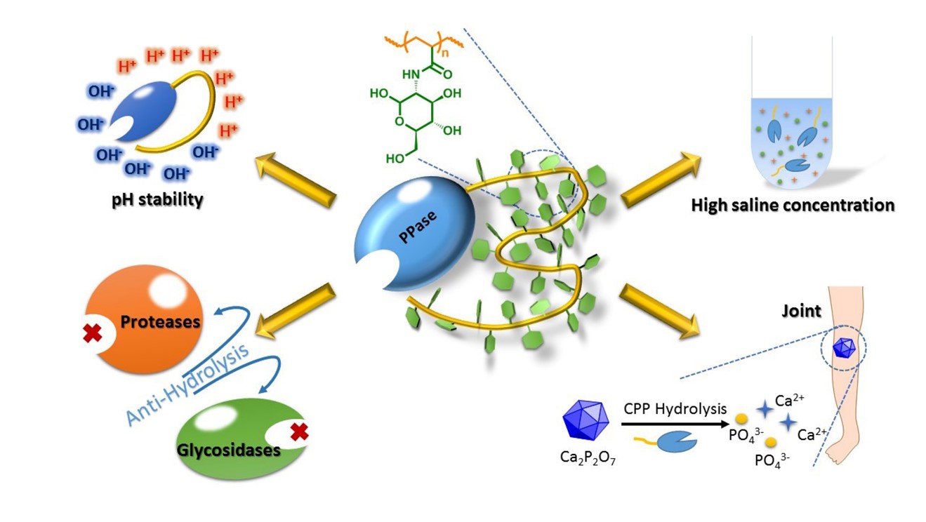 糖蛋白作为生命体中至关重要的组成部分,其多种多样的生物学功能使得体外合成糖蛋白的研究一直备受关注,但由于自身结构的复杂性限制了糖蛋白的应用。为此,本文以无机焦磷酸酶(PPase)为研究对象,通过聚合物-蛋白质偶联技术制备了一种糖蛋白类似物:含糖聚合物-蛋白质的偶联物(PMAG-PPase Conjugate)。在该工作中,作者着重研究了该种糖蛋白类似物各方面的理化性质的变化情况,研究发现,经过含糖聚合物的修饰,蛋白质在较高的酸、碱和盐溶液中均表现出比未修饰蛋白质更为优异的稳定性,以及有效抵抗蛋白酶和糖苷酶的水解作用,具有潜在的体内应用价值。不仅如此,利用PPase自身能够水解焦磷酸盐的特点,作者成功地将PMAG-PPase用于水解焦磷酸钙晶体,对于治疗焦磷酸钙沉积病(类痛风)提供了可行性的策略。