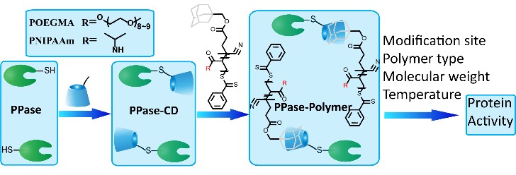 制备结构明确的蛋白质-聚合物偶联物以及充分理解它们的性质能够较好的促进治疗性蛋白的发展。在不同环境下维护和控制蛋白质的活性对蛋白质-聚合物偶联物应用非常重要。本文中,通过基因定点突变的方法制备了活性中心对位和邻位含有巯基的蛋白质,然后与修饰有马来酰亚胺基团的环糊精反应,使蛋白表面修饰上一个环糊精分子,最后通过主客体相互作用与通过自由基可控聚合制备的端基具有金刚烷的聚合物结合,制备了结构明确的蛋白质-聚合物偶联物。高效液相色谱以及体积排阻色谱实验结果显示我们成功制备了蛋白质-聚合物偶联物。然后我们对制备的具有不同聚合物类型,不同聚合物分子量以及不同结合位点的蛋白质-聚合物偶联物进行了不同温度下的活性研究。实验结果显示不同聚合物分子量以及不同种类的聚合物对蛋白不同位点修饰后对蛋白的活性的保持具有较大的差异。本文的研究将对设计制备性能优异的蛋白质-聚合物偶联物,发展蛋白类药物具有重要的指导意义。