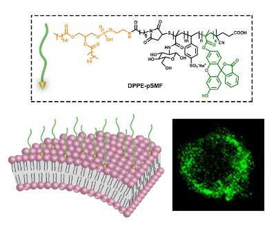 在细胞膜表面引入具有特异性生物活性的大分子是探索细胞与细胞间交流以及调控细胞功能的强大手段。因此,设计一种简单便捷的方法将生物活性大分子修饰到细胞膜表面具有十分重要的意义。聚糖作为一类代表性生物大分子,其能够被锚定到磷脂基团而插入到细胞膜表面。本研究中第一次将可逆加成-断裂链转移(RAFT)聚合和聚合物后修饰相结合来制备含有磷脂基团的聚糖。首先通过RAFT聚合制备了绿色荧光素标记的三元共聚物pSMF,随后以马来酰亚胺官能化的DPPE分子作为间隔臂来实现pSMF的磷脂化,从而得到含有磷脂基团的新型聚糖分子DPPE-pSMF。细胞截面的共聚焦荧光显微镜图片证实了DPPE-pSMF能够成功插入到HeLa细胞膜。并且没有绿色荧光素标记的磷脂化聚糖DPPE-pSM能够促进L929细胞的生长。合成糖聚物的组成以及分子量能够通过简单地改变单体的投料比以及聚合反应时间得到调控。相比于传统制备磷脂化糖聚物的方法,本研究中的方法不受限于天然聚糖结构异质复杂性等因素的影响,并且可以通过制备一系列具有特定结构的糖聚物前体而得到相应的磷脂化糖聚物,所得到的磷脂化糖聚物通常可应用于研究涉及细胞膜表面微环境调控的细胞功能。