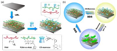 实现材料表面对细菌的特异性捕获与释放在生物检测领域具有重要的实用意义。在本工作中,我们结合层层组装技术和主客体相互作用构建了一种能够特异性捕获-释放细菌的生物活性表面。首先选择具有特异性识别I型鞭毛类大肠杆菌的α-D-甘露糖作为配体,通过点击化学将其固定到主体分子β-环糊精上。而后通过层层组装技术在氨基活化的金表面上交替沉积了含有金刚烷基团的聚丙烯酸共聚物和聚丙烯胺,从而得到含有客体分子金刚烷基团的聚电解质多层膜。最后利用主客体相互作用,将甘露糖分子修饰的β-环糊精引入到表面。通过多种表征手段证实了表面的成功制备。细菌黏附实验结果表明该表面可以高效特异性捕获大肠杆菌(E. coli)而对其他的菌种没有明显的识别作用。同时,利用十二烷基磺酸钠(SDS)溶液处理表面可以破坏主客体相互作用从而释放捕获的细菌,最终使表面恢复初始状态并可用于再次负载甘露糖分子修饰的β-环糊精。本文所采用的层层组装技术相比于聚合物刷、单分子层自组装可以负载更多的生物活性分子,并且将七个甘露糖修饰到环糊精上,可以形成“糖簇效应”,提高对细菌的捕获率。