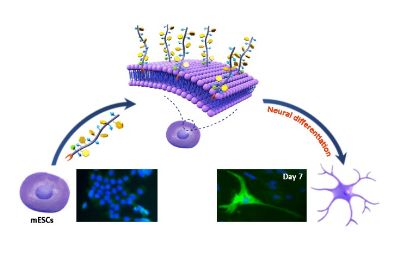 发展一种有效的方案促进胚胎干细胞的神经分化是实现其在治疗神经退行性疾病中应用的前提。在该工作中,我们合成了磷脂基团修饰和不含磷脂基团的糖胺聚糖类似物(lipo-pSGF & pSGF),研究了两者促进小鼠胚胎干细胞(mESCs)神经分化的效果。结果表明lipo-pSGF能够插入细胞膜表面并且能够更高效地促进mESCs的神经分化(分化14天,lipo-pSGF孵育的细胞神经特异性表达蛋白β3-tubulin表达量分别是天然肝素孵育的细胞的~3.8倍,pSGF孵育的细胞的~1.9倍)。随后,我们通过分析成纤维生长因子2(FGF2)介导的细胞外信号调节激酶1和2(ERK1/2)信号通路,研究了lipo-pSGF促高效神经分化可能的机制。结果显示lipo-pSGF能够有效地结合FGF2并且能够大大提高ERK1/2的激活(即磷酸化)。这些研究结果证实了利用我们合成的磷脂化糖聚物改性细胞膜表面来促进胚胎干细胞神经分化的高效性,并且这个方案能够扩展应用到细胞膜上受体调控的其他细胞行为。