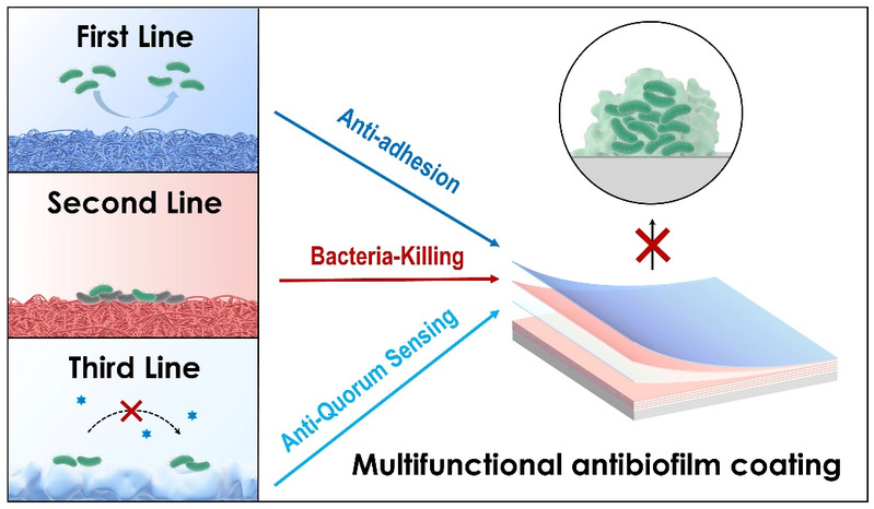 Three Lines of Defense: A Multifunctional Coating with Anti-Adhesion, Bacteria-Killing and Anti-Quorum Sensing Properties for Preventing Biofilm Formation of Pseudomonas aeruginosa