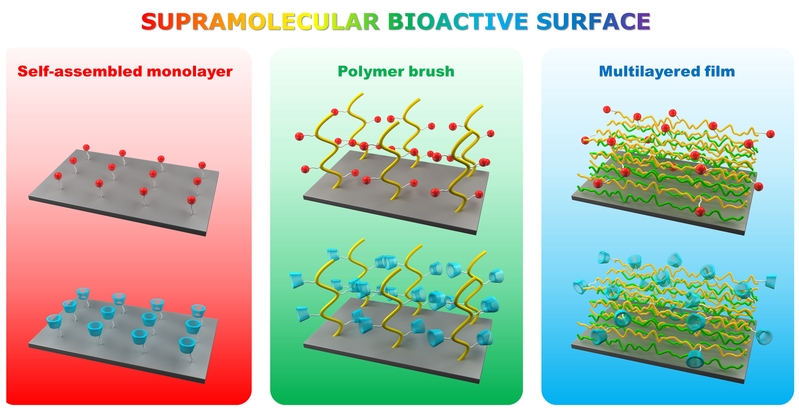 以分子识别为基础的超分子主客体相互作用为复杂结构和功能组装体的构建提供了一种简便和通用的方法。近年来,主客体相互作用被用于向固体基材表面引入生物活性分子和聚合物,以此来构建生物活性表面。利用一种常见的主客体分子—β-环糊精和各种客体分子作为分子组装基元,我们课题组和一些其他课题组通过主客体相互作用构建了一系列具有多功能性和/或刺激响应性生物活性表面。与传统的基于共价键固定生物配体的方法相比,基于主客体相互作用的方法更加简便、适用范围更广(具有普适性)且表面功能易于再生。在本文中,我们对最近通过β-环糊精基主客体相互作用构建生物活性表面的工作进行了归纳与总结。根据基质层的不同(自组装单分子膜、聚合物刷和层层组装多层膜),我们将这些表面材料分为三部分进行讨论。同时,这种主客体的方法也可以从材料表面拓展到活细胞表面。因此,我们也对这个领域的工作进行了小结。希望本综述能给表面改性工作者们一丝启发。