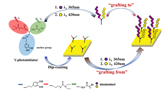 混合聚合物刷因其有着独特界面性质,因而被广泛应用于基础研究和技术应用。它们能够通过表面不同引发锚点引发聚合得到,然而,不同锚点在表面附着能力不同,很难保证形成良好的均匀分布层,另外,聚合物在表面附着性的差异,也很难保证均匀分布,容易形成“海岛”结构。因此,合成了一种基于茶酚的新型仿生y型二元光引发剂,其聚合物刷可以通过“grafting to”和“grafting from”两种策略对材料表面改性。y型二元光引发剂的“腿”是由邻苯二酚作为表面锚定,两个“手臂”是光引发剂的组成部分,彼此独立,能够接受不同辐射波长,先后使用紫外光和可见光,每条“手臂”能够独立激活,进而接枝不同聚合物刷。因此,我们可以进一步开发利用这种用于接枝聚合的新型y型光引发剂制备多种功能定制属性的界面。